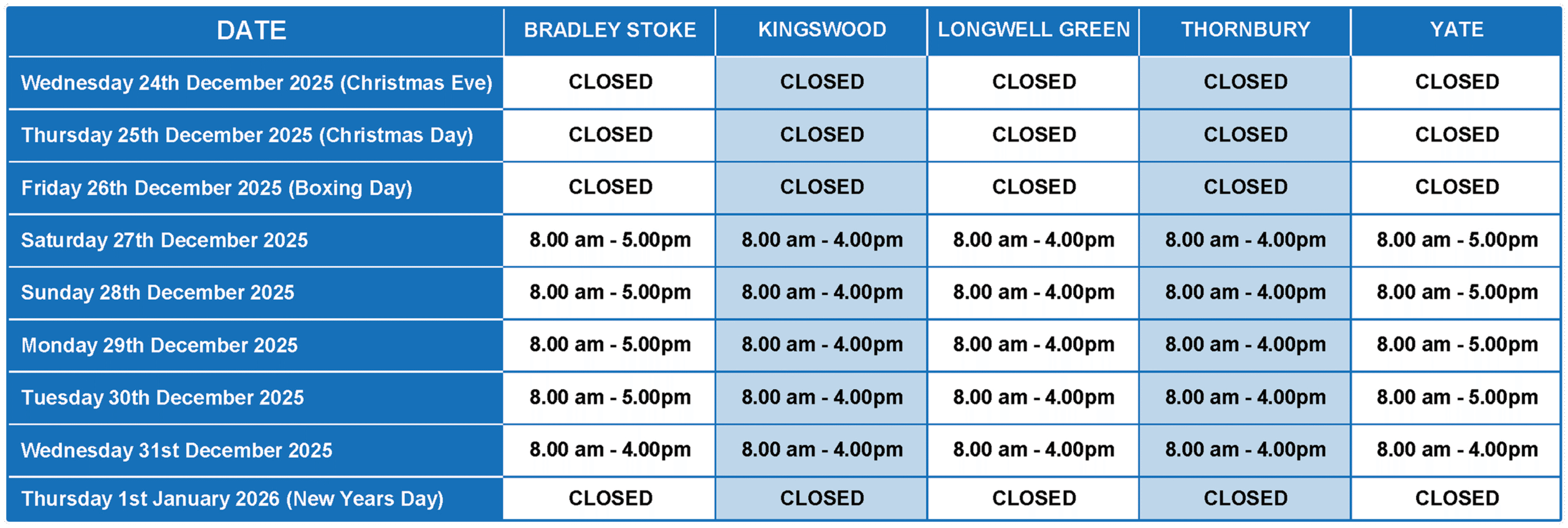 Christmas Opening Times